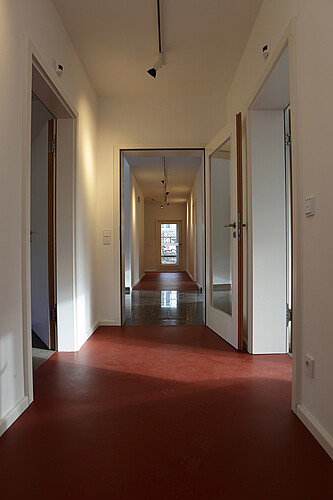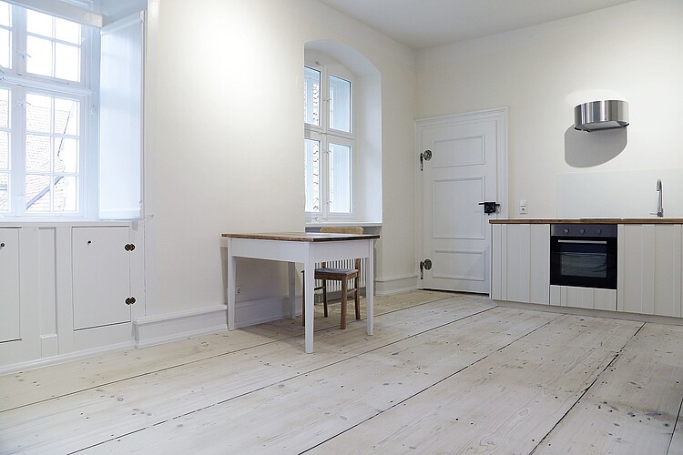 Eine großzügige Wohnung mit 100 Quadratmetern im Obergeschoss des Ostflügels ist renoviert und neu aufgeteilt worden. Neben einer neu gestalteten Zwei-Zimmerwohnung mit gut 51 Quadratmetern entstanden ein Seminarraum für 15 Personen, ein Besprechungszimmer samt Teeküche und WC. Außerdem wurde die Haustechnik vollständig saniert. Gestaltet wurden die Räume mit Holzdienen und Linoleum sowie Lehm- und Kalkfarbe für die Wandoberflächen in hellen Farbtönen. Das Farbkonzept basiert auf historischen Befunden.
