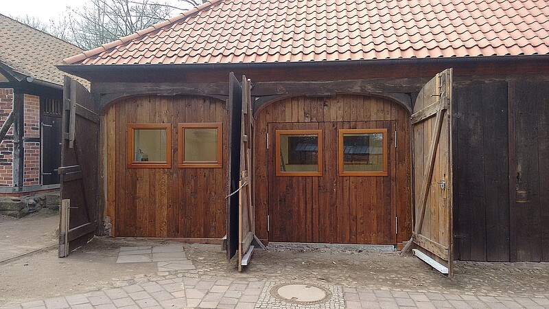 Ursprüngliche Optik mit modernem Inhalt: Die geöffneten Holztore geben den Blick frei für die Werkstattbox. Foto: Klosterkammer