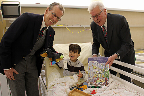 Überraschung zum Advent: Klosterkammer-Präsident Hans-Christian Biallas überreichte am 27. November 2018 kleine Geschenke an Patienten im Kinder- und Jugendkrankenhaus AUF DER BULT. Sie erhielten Adventskalender mit bunten Motiven aus dem Klosterkammer-Wimmelbuch sowie die dazu passende Plüschfigur des Dackels Ekki.