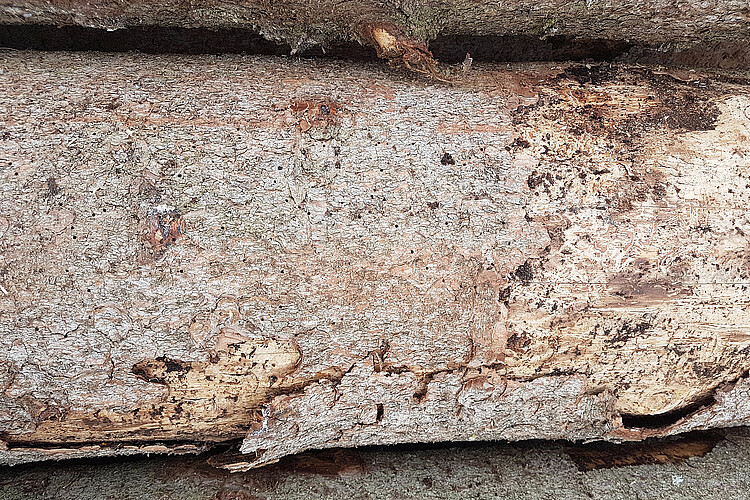 In der Nahaufnahme von Stämmen, die vom Borkenkäfer geschädigt wurden, ist der Befall sichtbar. Foto: Andreas Brandt/Klosterforsten