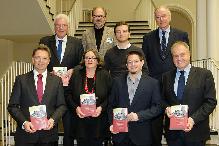 Die Pressekonferenz an der Leibniz Universität begleiteten: Prof. Dr. Volker Epping, Christiane Schröder, Dr. Christian Hellwig, Prof. Dr. Detlef Schmiechen-Ackermann (1. Reihe v. l.) sowie Klosterkammer-Präsident Hans-Christian Biallas, Prof. Dr. Carl-Hans Hauptmeyer, Dominik Dockter und Dr. Wilhelm Krull (2. Reihe v. l.). Foto: Harald Koch