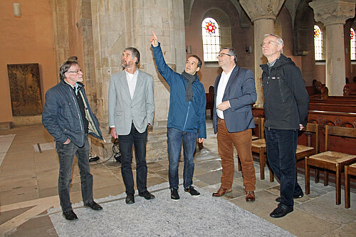 Klaus-Peter Netz, Vorsitzender des Bauausschusses, Pastor Thomas Gleitz, Architekt Oliver Gruba, Pastor Volker Milkowski, und Kirchenvorstandsvorsitzender Ludwig Büsing sehen sich in der Stiftskirche um (v. l.). Foto: Kristina Weidelhofer, Klosterkammer