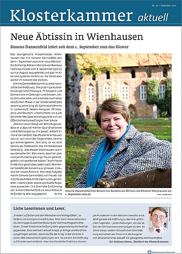 Die Klosterkammer gibt in ihrem Newsletter im Frühjahr und Winter Einblicke in ihre Aufgaben. Menschen stehen dabei oft im Mittelpunkt, in der aktuellen Ausgabe geht es um den Neustart einer Äbtissin sowie eines Pächter-Duos im Öko-Landbau.