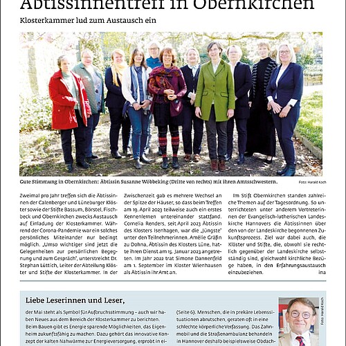 Einblicke in die Arbeit der Klosterkammer: In der aktuellen Ausgabe des Newsletters Klosterkammer aktuell geht es unter anderem um ein Treffen der Äbtissinnen im Stift Obernkirchen sowie um ein innovatives Konzept zur Energieversorgung in einem Baugebiet, in dem Erbbaurechte vergeben werden.