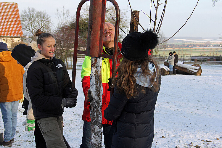 Die Wiese war leicht mit Schnee bedeckt, unterbrochen von dunkelbraunen Erdlöchern. Die mithilfe eines Minibaggers vorbereiteten Pflanzlöcher zeigten an, wo die neuen Obstbäume gepflanzt werden sollten. Die 14-Jährigen waren dick angezogen und mit Spaten ausgestattet. Nach Erklärungen zu den einzelnen Schritten, ging es los: Zunächst den Baum mittig platzieren, die Erde rundherum in das Pflanzloch auf die Wurzeln schaufeln und sorgfältig festtreten. Sabine Washof vom BUND Niedersachsen erklärte, wie die jungen Bäume geschützt werden. Dann trugen jeweils zwei der Jugendlichen Robinien-Pfähle heran, die zur Stabilisierung der Stämme dienen und um die herum ein Drahtgeflecht befestigt wurde, um vor Verbiss von Tieren zu schützen. Monika Seeger, Lehrerin der Bothfelder Waldorfschule sagte: „Gartenbau ist ein Fach bei uns. Dieser Tag ist ein Teil eines Praktikums.“ Gemeinsam mit ihrer Kollegin Maja Nedde begleitete sie die rund 40 Schülerinnen und Schüler der beiden 8. Klassen.