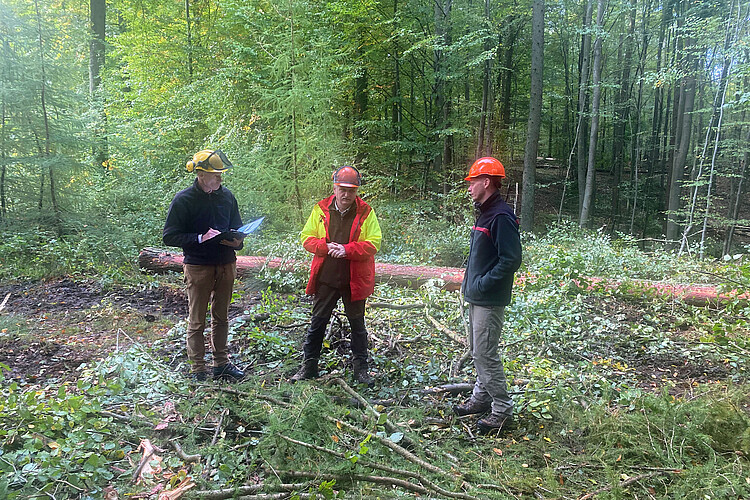 Für den 24. und 25. Oktober 2023 hatte sich der Prüfer bei den Klosterforsten angekündigt – welche Reviere sie anschauen würden, blieb bis zum Termin unklar, damit der Eindruck der Arbeitsweise vor Ort so realistisch wie möglich sein sollte. „Wir haben einen Tag im Büro Dokumentationen vorgezeigt und die verschiedenen Arbeitsbereiche des Betriebs vorgestellt. Es ging beispielsweise um die Aufgabenzuweisung an die Mitarbeiterinnen und Mitarbeiter, ihre Ausstattung, Fortbildung und den Gesundheitsschutz“, erläutert Constantin von Waldthausen, Leiter der Klosterforsten. Er fügt hinzu: „Wir haben auch thematisiert, mit welchen Forstunternehmen wir zusammenarbeiten, wie wir die Reviere bejagen, wie Pflanz- und Saatgut gewonnen und dokumentiert wird sowie, dass wir im Nord-Betriebsteil zwischen 2017 und 2019 Waldkalkungen gegen die Bodenversauerung durchgeführt haben.“